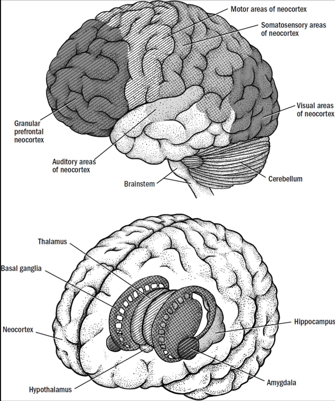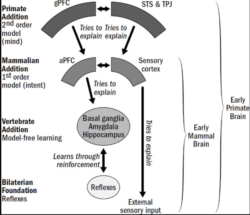 Mapping a mind is hard. AI certainly can’t do it. How do we? Bennett argues that mentalization arises from the complex interplay between the sensory cortex (our world model) and two other regions of the neocortex, the granular prefrontal cortex (gPFC) and the agranual prefrontal cortex (aPFC), which generates our self model. Bennett argues this system is generative, meaning that it is a prediction machine that is shaped (or fine-tuned) by the reciprocal circuitry that is continuously responding to self and external inputs and feedback. Moreover, having a theory of mind improved the ability of early primates to learn via imitation and anticipate future needs - something that was important given their frugivore diets.