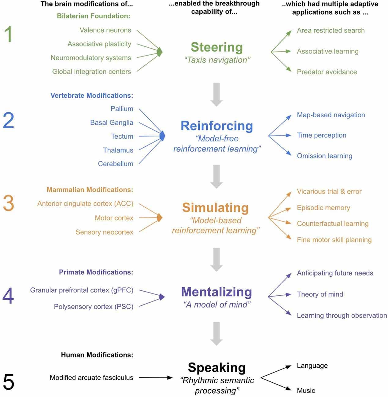 As the title indicates, the book is organized by five evolutionary breakthroughs that Bennett alleges account for human intelligence. In short, these adaption are steering, reinforcement, simulating, mentalizing, and language.