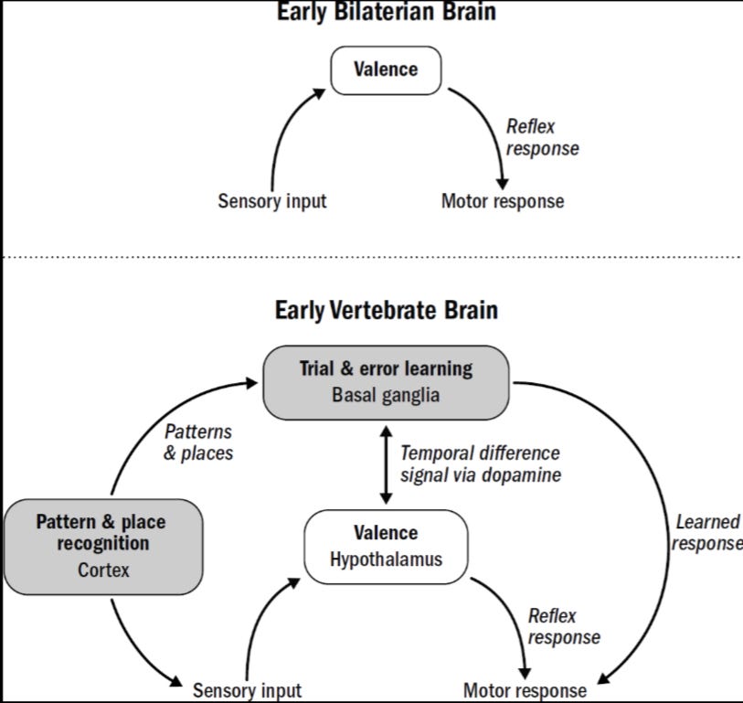 The big challenge that the fledgling forebrain faced was how to act when the reward sought requires a complex sequence of actions to reach. Alternatively, how can reinforcement take place when action and feedback are interceded on by time. This is the problem of “temporal difference learning.”