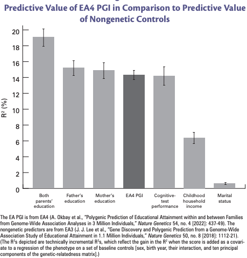 As our genetic knowledge grows in the modern genomics era, the improved PGIs may allow for reliable prediction of educational outcomes. This wouldn’t be just for years of education alone, but for other traits related to educational performance and achievement, including both cognitive and non-cognitive traits. The closer we get the measurement of traits to biology and understand how that biology influences social outcomes, the more powerful the genetic data will become. The amazing thing is that the PGI for educational attainment already outperforms or performs similarly with traditional social science variables (see figure below).