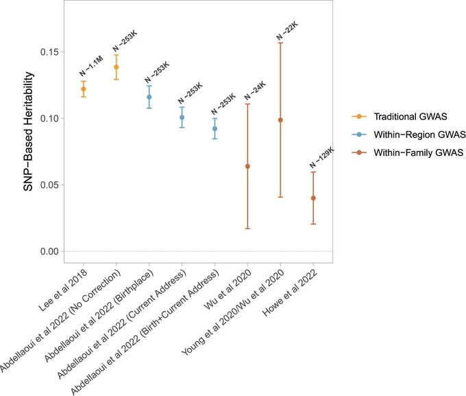 Given all this, I am particularly excited about the findings from the growing fields of sociogenomics (SG), behavioral genetics (BG), and/or psychiatric genetics. These intertwined disciplines use modern genomic techniques like genome-wide association studies (GWASs) to identify the genetic and non-genetic bases of cognition, social behavior, and its evolution. Behavioral genetics emerged from the work of statisticians like Sir Francis Galton, Sir Ronald Fisher, and Karl Pearson and heavily relied on twin-study designs for much of its history. Now, it is coming into maturity despite its fraught origins, using advanced approaches to dissect out confounders and identify direct genetic effects. One of the highest valence traits in the field and to society at-large is educational attainment and the related trait intelligence (IQ has been found to contribute to 43% of the variance in educational attainment).