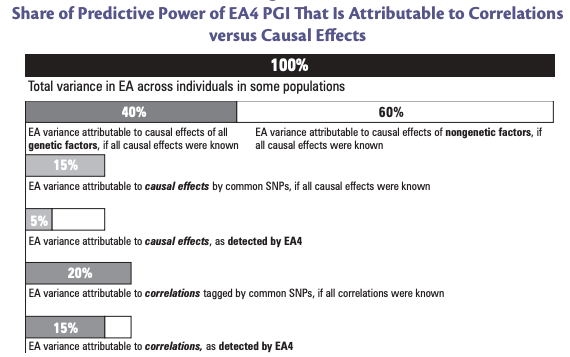 Studies of twins and adoptees in developed, Western countries have repeatedly shown that variation in genes plays an important role (roughly 40%) in explaining the differences in educational outcomes among people. This 40% figure for educational attainment is a measure referred to as “heritability.” Heritability is a statistical metric that describes the proportion of variation in a population accounted for by genetic factors. This can be further funneled down to identifiable causal effects as the figure below illustrates.