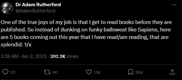 I’m not particularly eager to target anyone, but I stumbled across an obvious case that I think is worth highlighting here. There is a British science communicator named Adam Rutherford who has authored a few nonfiction science books. Most of these books have doubled as political tracts that attack alleged modern iterations of eugenics or at least are concerned with debunking myths about racial hierarchy and/or innate differences between races.6 Interestingly, Rutherford seems particularly eager to denigrate Sapiens, posting in snide ways about it with some regularity. His specific objections to the arguments or claims in the book are never provided in detail though. He also has promoted a critique of the factual errors in Sapiens that appears to make worse factual errors.7 In fact, the errors the piece makes are in Rutherford’s supposed area of expertise, genetics!